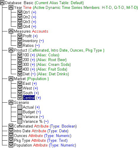 Each database member can have one or more formulas associated with it in the database outline. For example, the Variance members of the Scenario dimension, as shown in Figure Figure 2, contain formulas. Formulas can be simple or complex. For more information, see the Database Administrator's Guide.