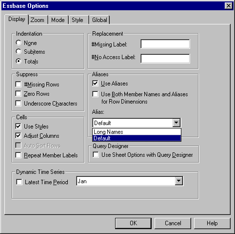 Figure 50. Enabling Aliases in the Essbase Options Display Tab