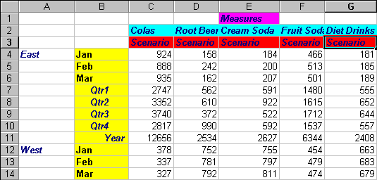 Essbase redisplays the worksheet and implements the newly defined styles. For example, members of the Scenario dimension are displayed with a red background.