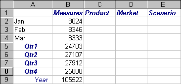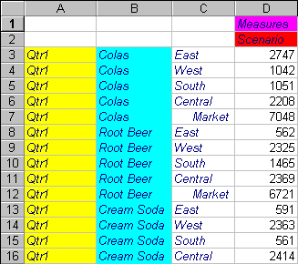 Essbase displays a member label in every column and row cell. For the Sample Basic database that you are using for this tutorial, repeating member labels is probably not necessary because the database is relatively small. This feature is particularly helpful for keeping track of member labels when scrolling through large worksheets.