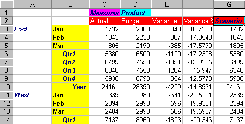 By default, Essbase displays member labels only once for each nested row and column group. If you are connected to a large database when using Essbase Spreadsheet Add-in, you may have to scroll down or across the worksheet to see additional data rows and columns. In some cases, as you scroll down or across, member labels may disappear from view. Essbase provides a feature for repeating member labels in each row or column cell that represents a data point so that you can always see a member label in the worksheet view.
