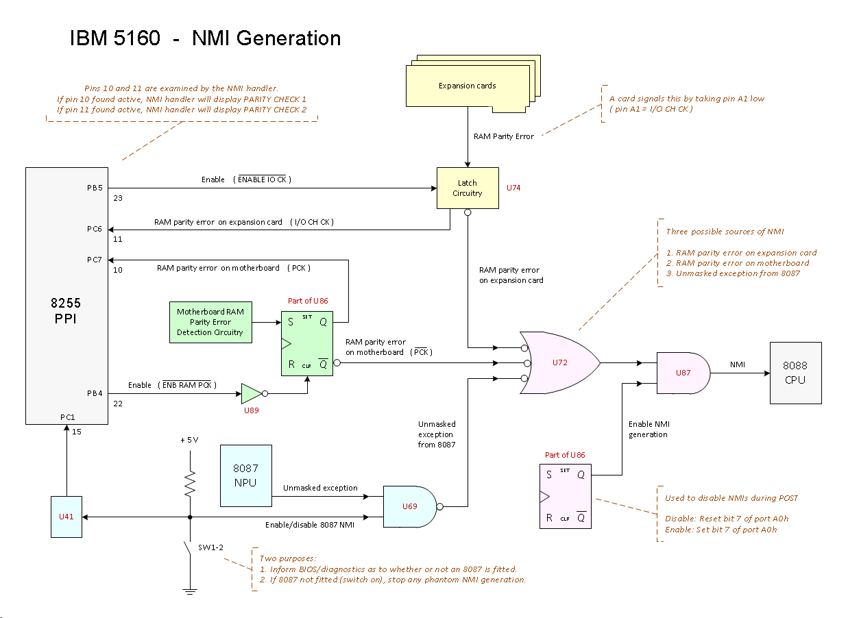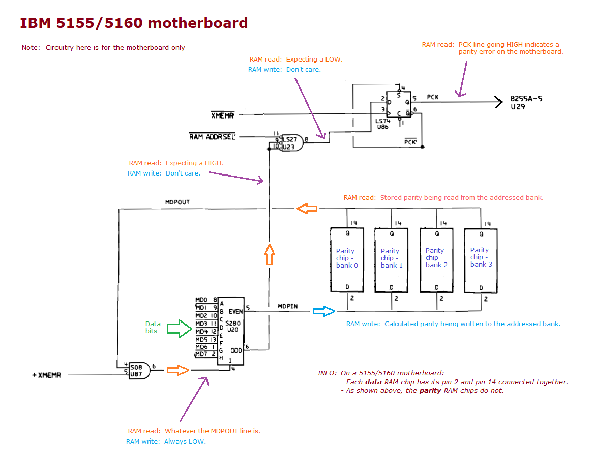 | PARITY CHECK 1 displayed on-screen | A parity error occurred when an address in motherboard RAM was read. Related diagram at here. Some possible causes: • 5160 motherboard - RAM chip failure. • 5160 motherboard - A RAM chip (possibly multiple) has a poor connection to the motherboard. • 5160 motherboard - bad parity generation circuitry. • 5160 motherboard - bad RAM refresh circuitry. • 5160 motherboard - bad filter capacitor/s close to the RAM chips. (Of those, suspect the tantalum type ones before the ceramic type ones.) • If intermittent, see note 2. |