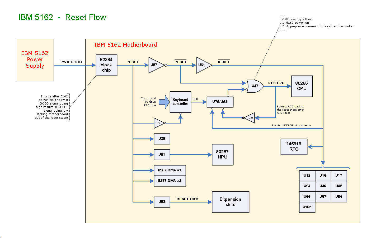 7. When the 82284 chip sees the power supply's POWER GOOD signal go high, it takes the motherboard's RESET line from high to low.  As a result, chips are taken out of the reset state.