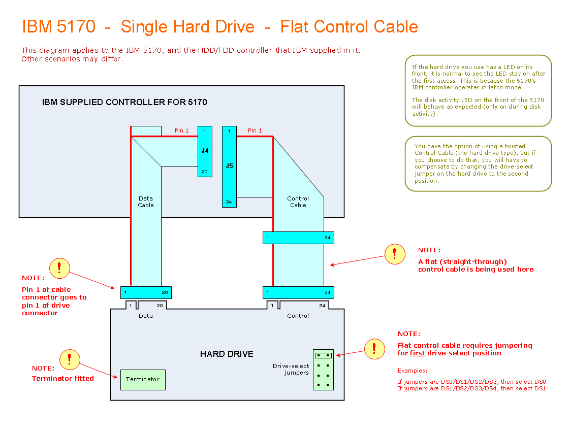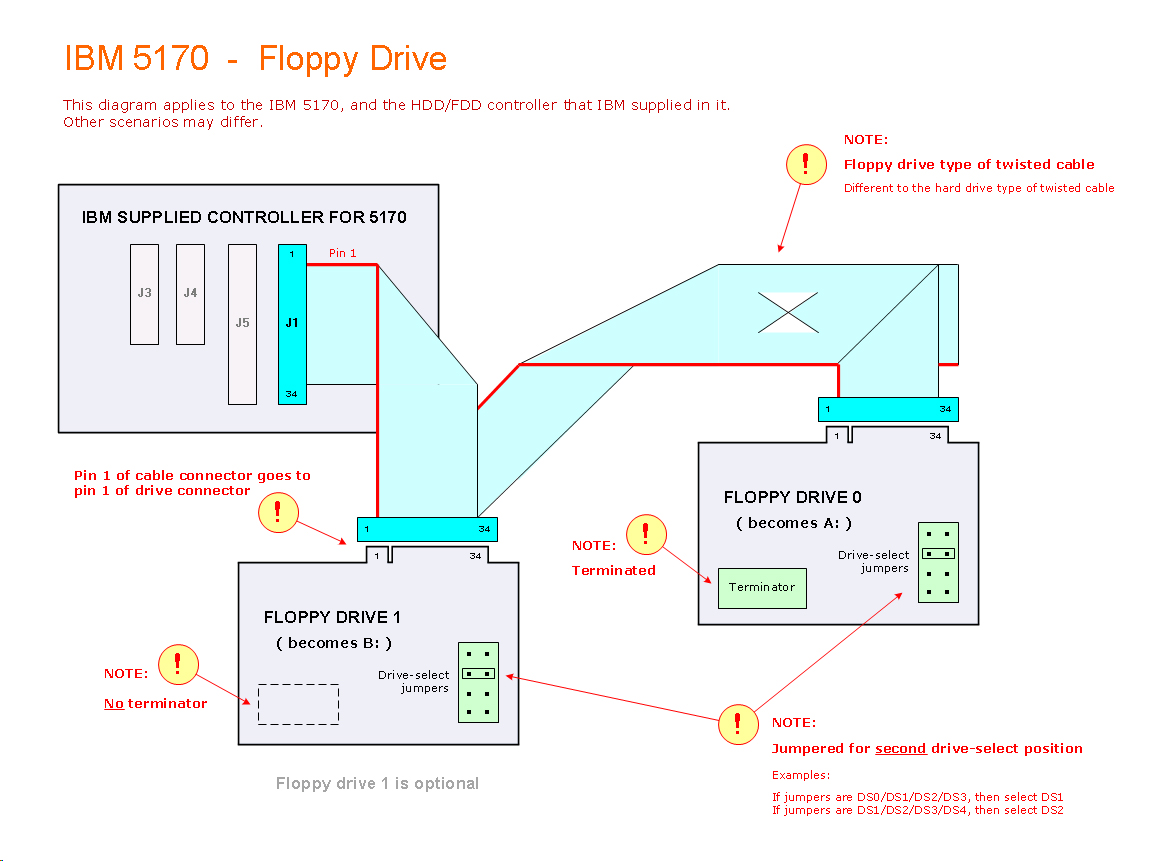 • You need to use the particular cable shown at here. The IBM controller expects it. The cable manipulates both the motor-on and drive-select lines.