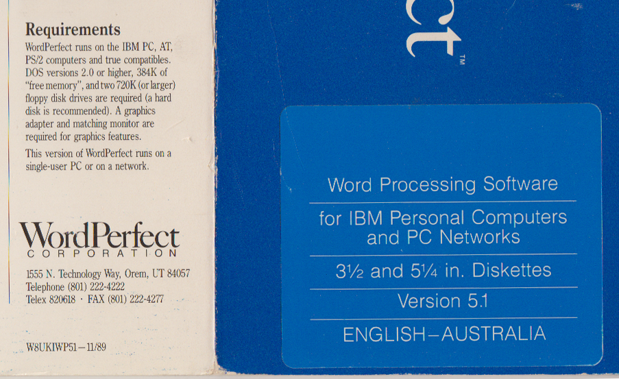 | WordPerfect 5.1 - Installation disks | (1989) (Australian version) (images of 720K sized disks) (use WinImage software to create 720K disks from supplied images) |