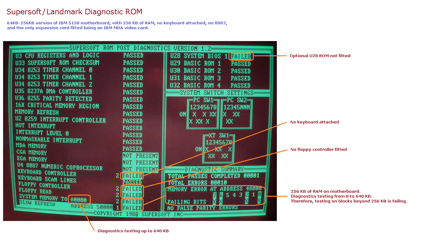 | • | The SYSTEM MEMORY TO A0000 test will fail if 640 KB (A0000 hex = 640K) of RAM is not fitted. So, that is 256 KB on the motherboard plus 384 KB on an expansion card. RAM related switches on the motherboard are ignored (switches SW1:3 and SW1:4, and SW2). If the only RAM fitted is the 256 KB on the motherboard, expect to see errors when the test advances past address 40000 (256K = 40000 hex). |