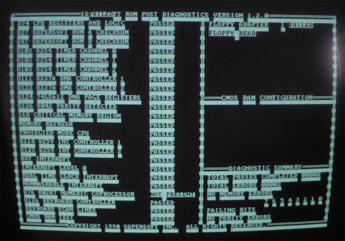 | • | Some video cards will not work with this AT version of the Supersoft/Landmark ROM's. - My functional IBM MDA card does not work (no beeps, no display). My second functional IBM MDA card does the same. - My IBM CGA card works. - My IBM EGA card (only 64 KB RAM fitted) will display, but poorly. Supersoft appears to think that I have CGA. - My clone MDA card (unbranded) works. - My clone CGA card (unbranded) works. - My clone EGA card (an AST-3G) initially displays this, but then displays normally once the EGA memory test has finished. - None of my VGA cards work. More information here. |
