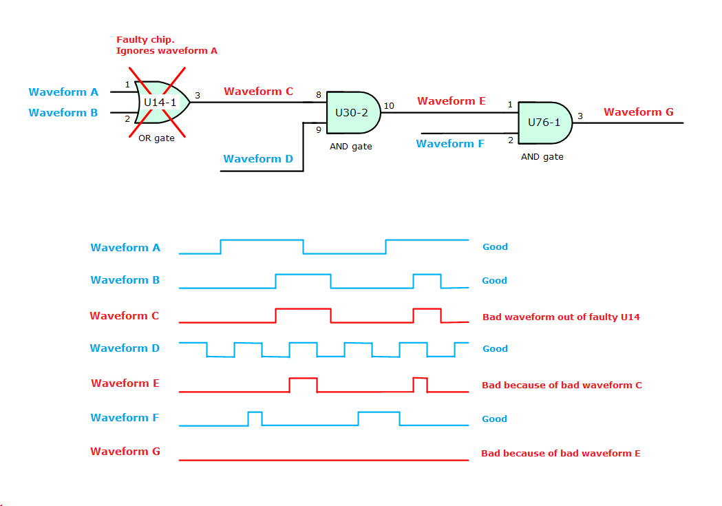 Note that because a logic probe does not convey timing information, certain use of the probe can sometimes be misleading.  For example, refer to the diagram at here.  Someone simply looking for lack of activity out of those chips will suspect a faulty U67 (no activity out of gate 1 of U67) whereas the faulty chip is U14.