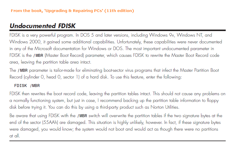 • The /MBR option of FDISK.EXE targets the first hard drive (relevant if you have multiple hard drives in your computer).