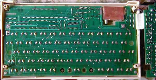 Front of the total unit removed from it's case. The multiple connections to the display are clearly visible, as is the black, coaxial cable connecting the UHF modulator with the TV out phono socket. The high voltage power supply for the flourescent display is also visible as the small cream coloured circuit board. This is shown in greater detail below.