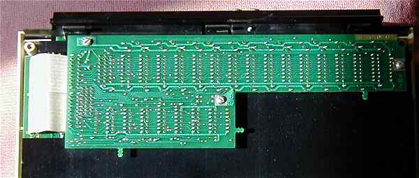 Unscrewing the four screws holding the base in place, with a small straight edged screwdriver, allows you to remove it and reveals the main RAM board attached to the large sheet of anodised aluminium, which acts as the main structural element, or core to the machine. The multiple ribbon cables attaching the RAM to the main board are clearly visible on the left, as are the three screws holding it in place. From the back of the case, lifting up from the left hand side very carefully should pull the main board up and away. Care should be taken to lay this over on the right hand side, so that excees strain on the ribbon cable attached to the keyboard is avoided, see below. You will now see the five screws holding the main board to the aluminum core. Removing these will allow the board to be separated from the aluminium sheet at the front to give better access to the two capacitors that need to be replaced.