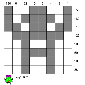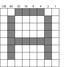 This does depend on which character set or font you are using, but I'm sure you get the idea. By treating each column as a bit in an 8-bit byte, we get the following representation by adding the value of each column that is set. Row 0 is 32+16+8+4=60.