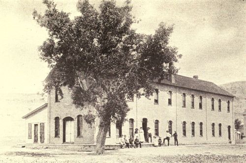 The "town" of Little Missouri consisted of a group of primitive buildings scattered about the shack which did duty as a railroad station. The Pyramid Park Hotel stood immediately north of the tracks; beside it stood the one-story palace of sin of which one, who shall, for the purposes of this story, be known as Bill Williams, was the owner, and one who shall be known as Jess Hogue, the evil genius. South of the track a comical, naïve Swede named Johnny Nelson kept a store when he was not courting Katie, the hired girl in Mrs. McGeeney's boarding-house next door, or gambling away his receipts under Hogue's crafty guidance. Directly to the east, on the brink of the river, the railroad section-foreman, Fitzgerald, had a shack and a wife who quarreled unceasingly with her neighbor, Mrs. McGeeney. At a corresponding place on the other side of the track, a villainous gun-fighter named Maunders lived (as far as possible) by his neighbors' toil. A quarter of a mile west of him, in a grove of cottonwood trees, stood a group of gray, log buildings known as the "cantonment," where a handful of soldiers had been quartered under a major named Coomba, to guard the construction (p. 008) crews on the railroad from the attacks of predatory Indians seeking game in their ancient hunting-grounds. A few huts in the sagebrush, a half-dozen miners' shacks under the butte to the south, and one or two rather pretentious frame houses in process of construction completed what was Little Missouri; but Little Missouri was not the only outpost of civilization at this junction of the railroad and the winding, treacherous river. On the eastern bank, on the flat under the bluff that six months previous had been a paradise for jackrabbits, a few houses and a few men were attempting to prove to the world, amid a chorus of hammers, that they constituted a town and had a future. The settlement called itself Medora. The air was full of vague but wonderful stories of a French marquis who was building it and who owned it, body and soul.