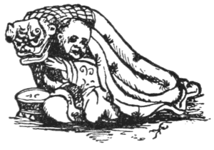 Korean Lion is the title of the picture which forms the frontispiece; it represents a game that children in Japan are very fond of playing. They are probably trying to act as well as the maskers did whom they saw on New[Pg 6][Pg 5] Year's Day, just as our children try and imitate things they see in a pantomime. The masker goes from house to house accompanied by one or two men who play on cymbals, flute, and drum. He steps into a shop where the people of the house and their friends sit drinking tea, and passers-by pause in front of the open shop to see the fun. He takes a mask, like the one in the picture, off his back and puts it over his head. This boar's-head mask is painted scarlet and black, and gilt. It has a green cloth hanging down behind, in order that you may not perceive where the mask ends and the mans body begins. Then the masker imitates an animal. He goes up to a young lady and lays down his ugly head beside her to be patted, as "Beast" may have coaxed "Beauty" in the fairy tale. He grunts, and rolls, and scratches himself. The children almost forget he is a man, and roar with laughter at the funny animal. When they begin to tire of this fun he exchanges this mask for some of the two or three others he carries with him. He puts on a mask of an old woman over his face, and at the back of his head a very different second mask, a cloth tied over the centre of the [Pg 8] head, making the two faces yet more distinct from each other. He has quickly arranged the back of his dress to look like the front of a person, and he acts, first presenting the one person to his spectators, then the other. He makes you even imagine he has four arms, so cleverly can he twist round his arm and gracefully fan what is in reality the back of his head.