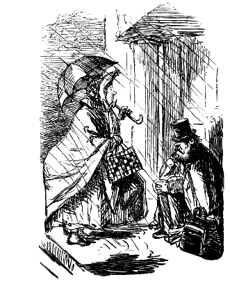 Swell (who has received Four Penn'orth of Coppers in Change). "HERE! BY JOVE, YOU KNOW LOOK HERE! HI! WHAT THE DEUCE!—I SAY—WHAT AM I TO DO WITH THESE HA'PENCE, YOU KNOW?"