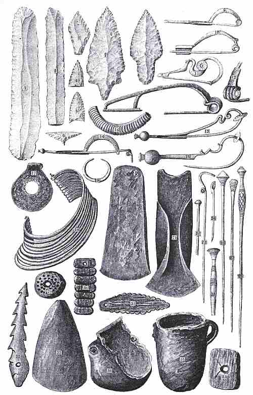 In these circumstances I resolved to proceed de novo, and to construct my story of the lake-dwellings from whatever trustworthy sources I could lay my hands on. In order to carry out this intention my wife and I perambulated the whole of Central Europe with note and sketch books in hand, visiting, as far as practicable, the sites of lake-dwellings, and searching museums and libraries wherever we thought their relics or records were to be found. The eastern limit of the region thus visited may be represented by a line drawn from Königsberg to Trieste, passing through the intermediate towns of Krakow, Buda-Pesth, and Agram. The materials brought together from within this area are, to a very considerable extent, absolutely new to British archæologists. Of course, in a work which aims at putting into the hands of general readers an epitome of the essential facts and results of lacustrine researches since these singular remains were discovered in Europe, I had to take cognisance of some investigations that have already been fully recorded and illustrated. As it was impossible to illustrate typical groups of objects from all the lacustrine stations, I have, as a rule, in selecting the illustrations for this work, avoided those that have already come within the reach of English readers through the translation of Keller's works, except when they belonged to stations that are the best or only representatives of their kind in their respective localities—as, for example, the Rosen Insel in the Lake of Starnberg. Acting on this principle, I have given very few illustrations of objects from Nidau, Moosseedorf, St. Aubin, Wauwyl; nor, for the same reason, is a prominent place given to the earlier discoveries at Robenhausen, Estavayer, Concise, Cortaillod, etc. In this way I have endeavoured to combine in the work now issued as much novelty as possible, without detracting from its general and comprehensive scope. [Pg viii]