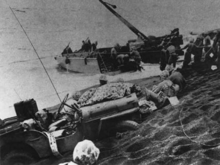 As soon as it hit the beach on the right side of the V Amphibious Corps line, the 25th Marines was pinned down by accurate and heavy enemy fire. Meanwhile, landing craft, supplies, and vehicles pile up in the surf behind Marines.