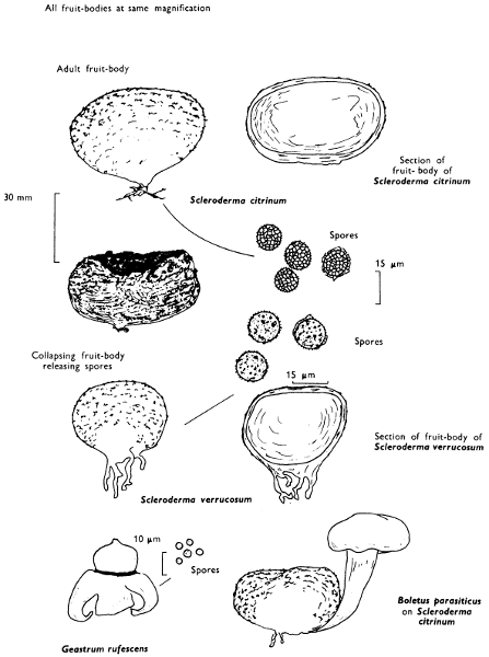 The term larger fungus refers to any fungus whose study does not necessarily require more than a low-powered lens to see most of the important morphological features. Using such a term cuts across the existing scientific classification, for it includes the more obvious fungi bearing their spores on specialised reproductive cells called basidia, fig. 5, and a few of those whose spores are produced inside specialised reproductive cells called asci. The term is useful, however, even though it embraces a whole host of unrelated groups of fungi; it includes the polypores, fairy-clubs, hedgehog-fungi, puff-balls and elf-cups, as well as the more familiar mushrooms and toadstools—or puddockstools as they are often called in Scotland. Specimens of all these groups will find their way some time into the collecting baskets of the naturalist when he is out fungus-picking, along with probably a few jelly-fungi and less frequently one or two species of the rather more distantly related group, the morels. The biggest proportion of the finds, however, on any one collecting day in the autumn, when the larger fungi are in their greatest numbers, will be of the mushrooms and toadstools; these are, collectively, more correctly called the agarics.