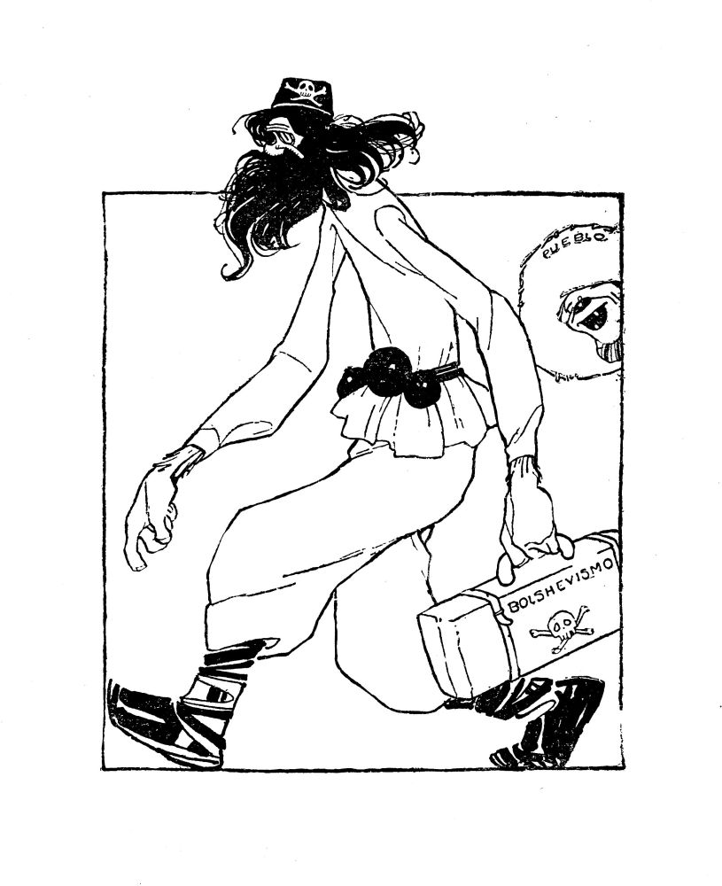 Cabral, who is quite young, was born in the year 1891, in Huatusco, a picturesque village in the State of Veracruz. As a child of three or four years he amused himself by tracing figures on the ground and before the age of fourteen he delineated figures of animals and saints on the walls of the village church. At that time he also discovered his future artistic bent in making profile caricatures of his younger brothers and school-fellows. His school teacher, early recognizing the ability{9} of the boy in draughtsmanship, persuaded the “Jefe Politico” of the district to solicit a scholarship from Señor Don Teodoro Dehesa, the enlightened Governor of the State. Señor Dehesa, a patron of art, who frequently acted as a Maecenas to struggling artists, granted the young Ernesto the coveted bursary which entitled him to enter the San Carlos Academy in the Capital of the Republic. There he was able to improve his technique, but the scholarship did not make him independent. To live and continue his studies it was necessary for him to earn money. He therefore commenced to draw for the public, collaborating in the publication of a lithographed political paper called “La Tarantula.” In this paper, directed by Fortunato Herrerías, he dedicated himself exclusively to the art of caricature. At the end of six months he joined the staff of the short-lived comic weekly “Frivolidades” which soon had to stop publication for want of funds. The next important step in Cabral’s career was his collaboration with Mario Vitoria, in the well-known political weekly “Multicolor” and through the medium of this paper his drawings became known to a wider and more influential circle. “Multicolor” had great political influence during the three years it was published (1911-1914), and helped very powerfully towards the making and unmaking of the political idols of the hour.