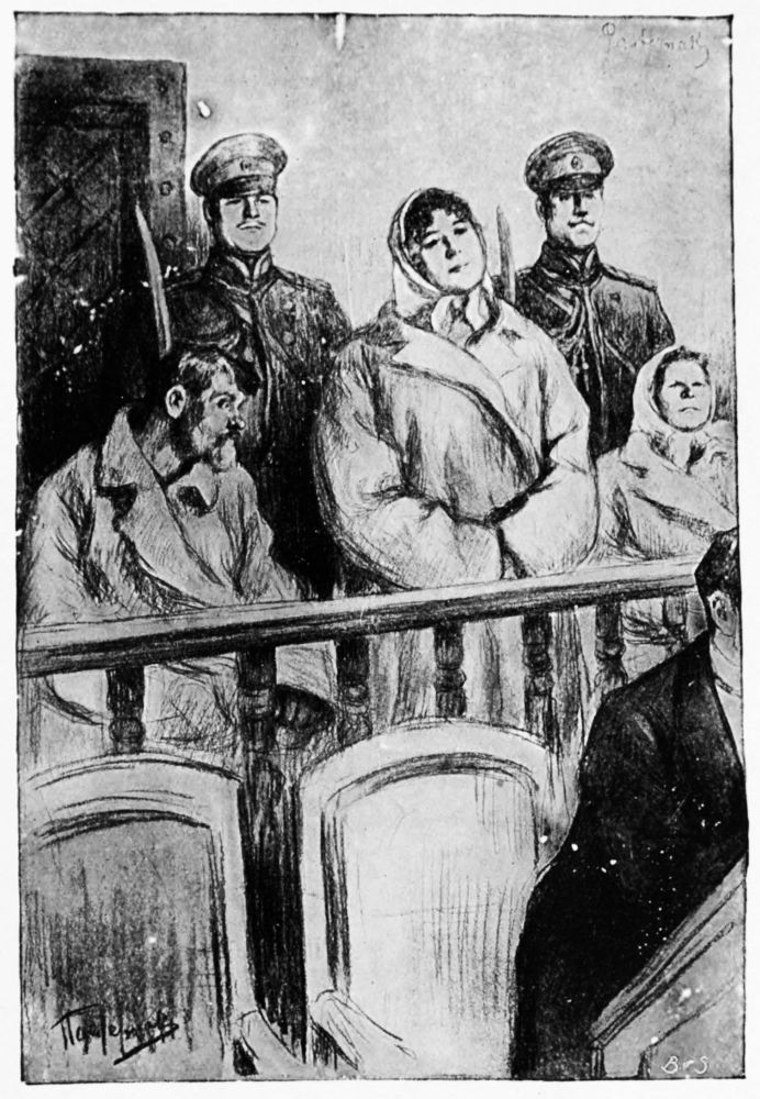 THE DEFENDANTS “The third prisoner was Maslova” (From an illustration by Pasternak in the English Edition of “Resurrection,” reproduced by kind permission of Mr. F. R. Henderson) |