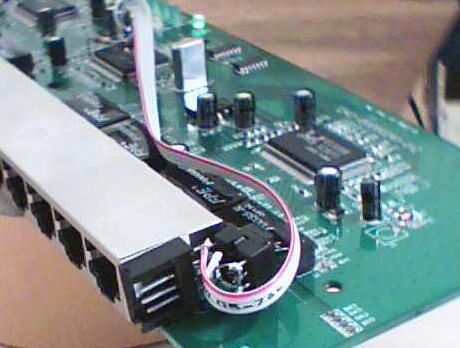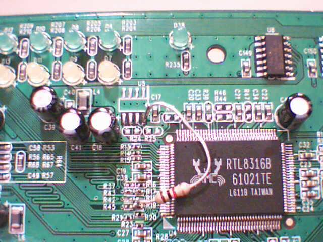 In the picture above, you see the RTL8136B with the strapping resistor on pin 121. The chip has 128 pins, numbered counterclockwise starting from the bottom left corner (near the white triangle). Pin 128 (power supply, incidentally) is just above the triangle, pin 121 just a little bit above. The pin is actually one of the TxD (for port 5), and it has in series a 50 Ohm resistor, labeled R19. Next to it there are spare pads for R45, which is exactly the strapping resistor that I need. Not having a small enough device, i carefully soldered the resistor on one of the pads of R19, and the other terminal goes to the power pad where you could also connect the serial EEPROM to store configuration information.